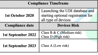 Reference to the published requirements for medical devices unique device identification (Saudi-DI) by Saudi Food & Drug Authority and after launching of UDI database (Saudi-DI), therefore, the timeframe to comply with the requirements has been updated as follows: